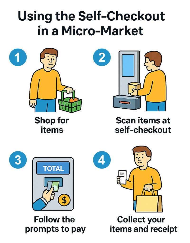 A Micro Market is a self-service convenience store located inside your workplace. Instead of traditional vending machines, employees enjoy open shelving, coolers, and free-flowing access to snacks, meals, and beverages — all paid for using a simple self-checkout kiosk or mobile app.